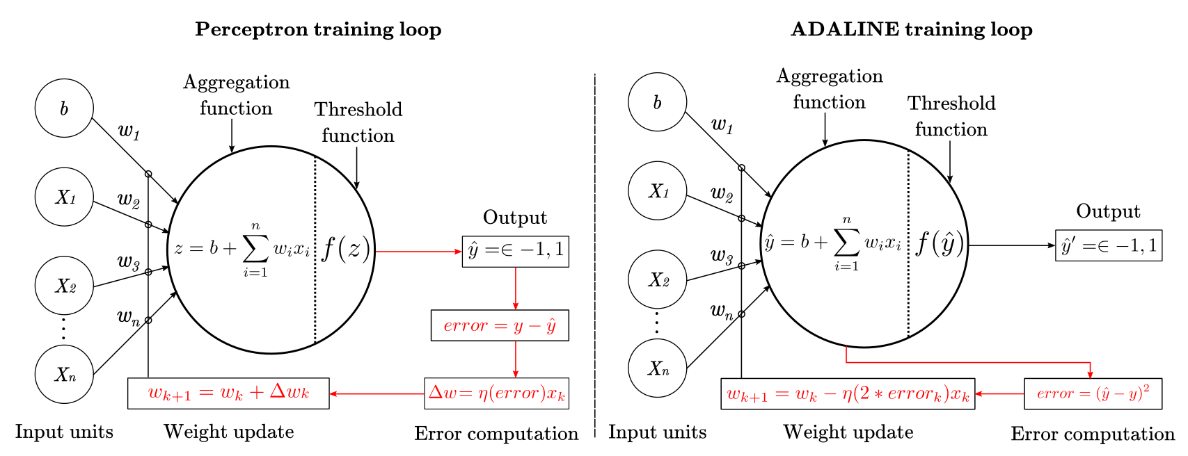 그러나 반응층 요소의 출력 값의 경우, 퍼셉트론은 활성화 함수 이후에, Adaline은 활성화 함수 이전에 도출되기 때문이다.